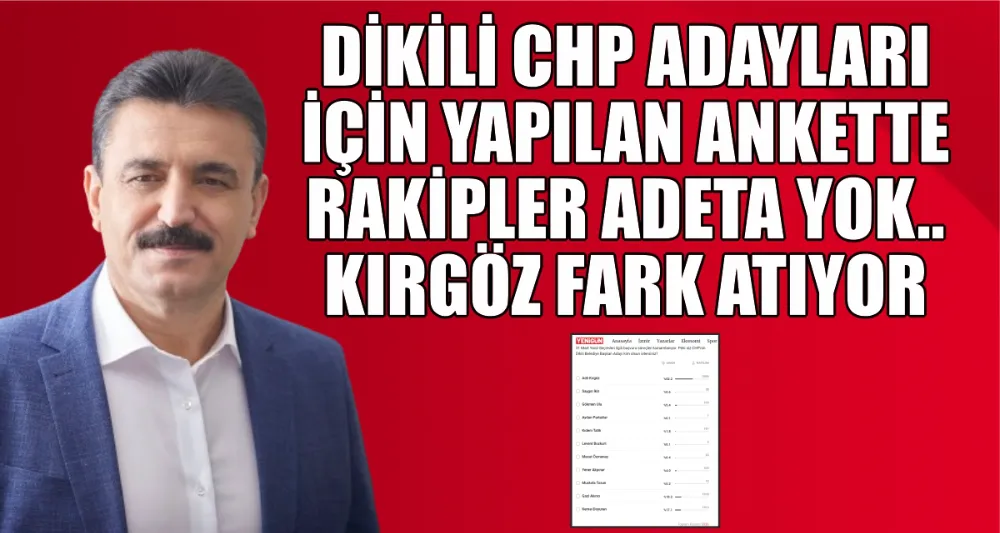 Yenigün adlı gazetenin dijital ortamda yaptığı ankete göre Dikili CHP'de aday adayları arasında Belediye Başkanı Adil Kırgöz parti içindeki rakiplerine büyük fark atıyor. Sadece iki rakibin % 17 ve 18 gibi orana ulaşabildiği ankette diğer tüm aday adaylarının esamesi bile okunmuyor.