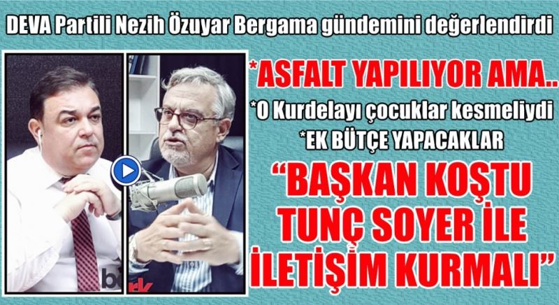 DEVA Partili İzmir Büyükşehir ve Bergama Belediye Meclis Üyesi Nezih Özuyar www.bakircayturk.com 'da Murat Karakaş'ın sorularını yanıtladı. İlçeye yapılan olumlu icraatları taktir etmekle beraber eksik yanlarını da muhalefet olarak daima dile getirmenin görevleri olduğunu vurgulayan Özuyar Bergama gündemine ilişkin önemli açıklamalar ve tespiterde bulundu. Bütçe görüşmelerini değerlendiren Özuyar arazi satışlarında görülen köylünün tepkisini birkez daha dile getirdi. Birçok soruyu yanıtlatan Özuyar ile yapılan yayının kaydını bu videoda izleyebilirsiniz.