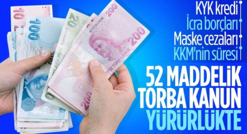 Ekonomiye ilişkin torba kanun Resmi Gazete'de yayımlanarak yürürlüğe girdi. Kanunda KYK faizleri, elektrik ve doğalgaz desteğinin yanı sıra icra borçları ile maske cezaları yer alıyor.