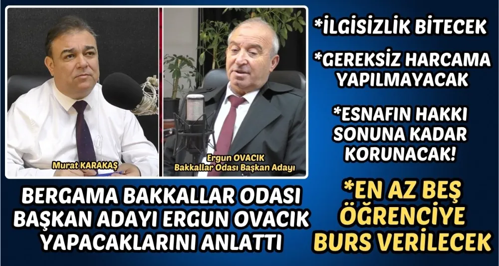 15 Şubat 2026 Günü gerçekleşecek Bergama Bakkallar ve Benzerleri Odası kongresinde Başkan Adayı olan Ergun Ovacık www.bakircayturk.com'da Murat Karakaş'ın yayın konuğu olarak seçildiği takdirde yapacaklarını anlattı. Esnafa olan ilginin daha da artacağını, oda üyelerinin haklarının sonuna kadar korunacağını belirtti. Daha bir çok projesini anlatan Ovacık ile yapılan yayını videoda izleyebilirsiniz.
