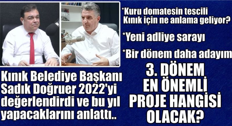 Kınık Belediye Başkanı Dr. Sadık Doğruer 09 Ocak Pazartesi günü 15:00'te www.bakircayturk.com 'da Murat Karakaş'ın canlı yayın konuğu olarak soruları yanıtladı. Doğruer geride bıraktığımız 2022 Yılını değerlendirdi ve 2023'te Kınık'ta yapılacakları anlattı.. Videoda izleyebilirsiniz.