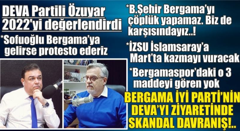 DEVA Partili İzmir B.Şehir ve Bergama Belediye Meclis Üyesi Nezih Özuyar www.bakircayturk.com 'da Murat Karakaş'ın canlı yayın konuğu olarak soruları yanıtladı. Özuyar Bergama belediye yönetiminin 2022 Yılı icraatlarını değerlendirirken çeşitli eleştirilerde de bulundu.