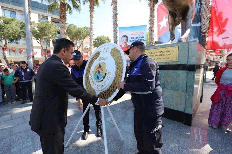 Mazbata sonrası coşkulu kalabalık eşliğinde Dikili Atatürk Meydanı’na giden Dikili Belediye Başkanı Adil Kırgöz, Atatürk Anıtı’na çelenk sundu.