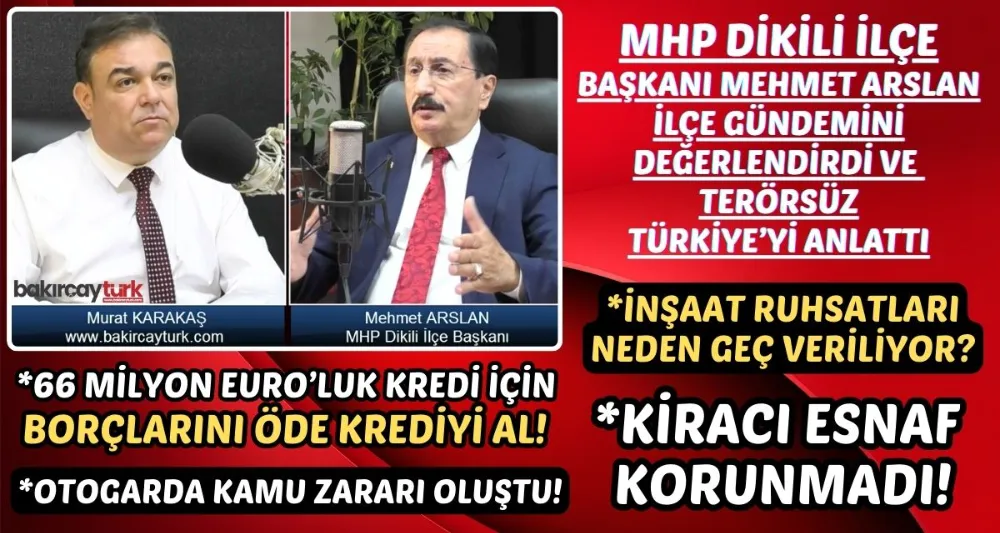 MHP Dikili İlçe Başkanı Mehmet Arslan www.bakircayturk.com'da Murat Karakaş'ın yayın konuğu olarak sorularını yanıtladı. Arslan, Dikili ilçe gündemini değerlendirdi ve Belediye Başkanı Adil Kırgöz'ü bazı icraatlarından dolayı eleştirdi. 66 Milyon euro tutarındaki arıtma ve kanalizasyon tesisi kredisinden, pazaryeri sorununa, kiracı esnafın mağduriyetinden Çandarlı mahallesi sakinlerinin şikayetlerine kadar birçok konuya değinen Arslan ile yapılan yayının kaydını videoda izleyebilirsiniz.