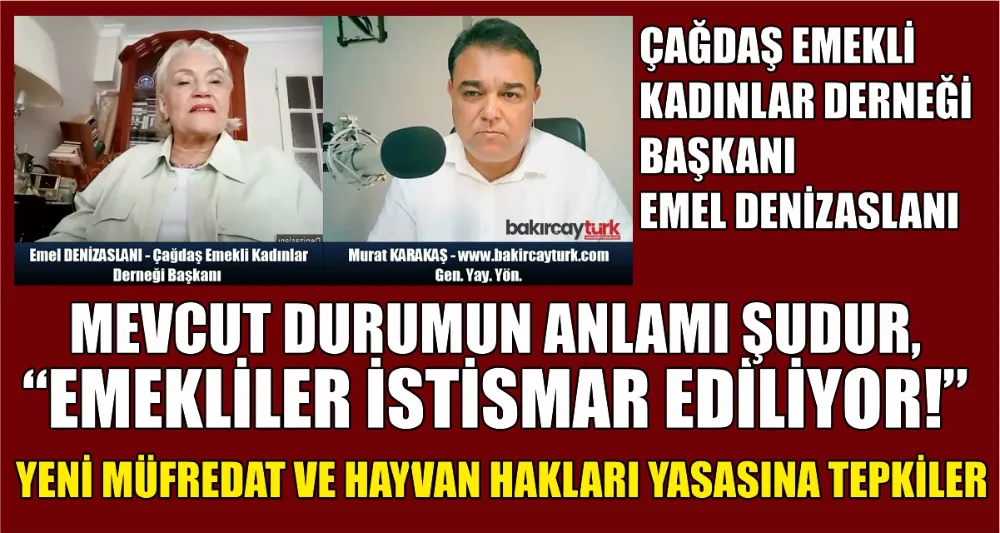 Çağdaş Emekli Kadınlar Derneği Başkanı Emel Denizaslanı www.bakircayturk.com'da Murat Karakaş'ın yayın konuğu oldu. Denizaslanı bu derneği neden kurduklarını anlatırken emeklilerin bugün yaşadığı büyük zorluklara dikkat çekti. Öte yandan çıkarılmak istenen eğitimdeki yeni müfredatı ve hayvan hakları yasasını da eleştiren Emel Denizaslanı ile yapılan yayını videoda izleyebilirsiniz.