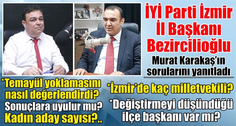 İYİ Parti İzmir İl Başkanı Sinan Bezircilioğlu www.bakircayturk.com'da Murat Karakaş'ın canlı yayın konuğu olarak gündeme ilişkin soruları yanıtladı. Bezircilioğlu geçtiğimiz pazar günü yapılan temayül yoklamasının sonuçlarının uygulanıp uygulanmayacağı sorusunu yanıtlarken kendisine listelerde kadın adaylara ağırlık verilmesi beklentisi olduğu hatırlatıldı. Bezircilioğlu bu seçimde İzmir'de toplam 9 Milletvekili çıkaracaklarını da öne sürdü.