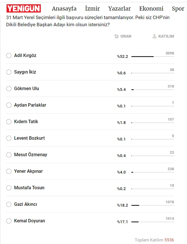 Yenigün adlı gazetenin dijital ortamda yaptığı ankete göre Dikili CHP'de aday adayları arasında Belediye Başkanı Adil Kırgöz parti içindeki rakiplerine büyük fark atıyor. Sadece iki rakibin % 17 ve 18 gibi orana ulaşabildiği ankette diğer tüm aday adaylarının esamesi bile okunmuyor.