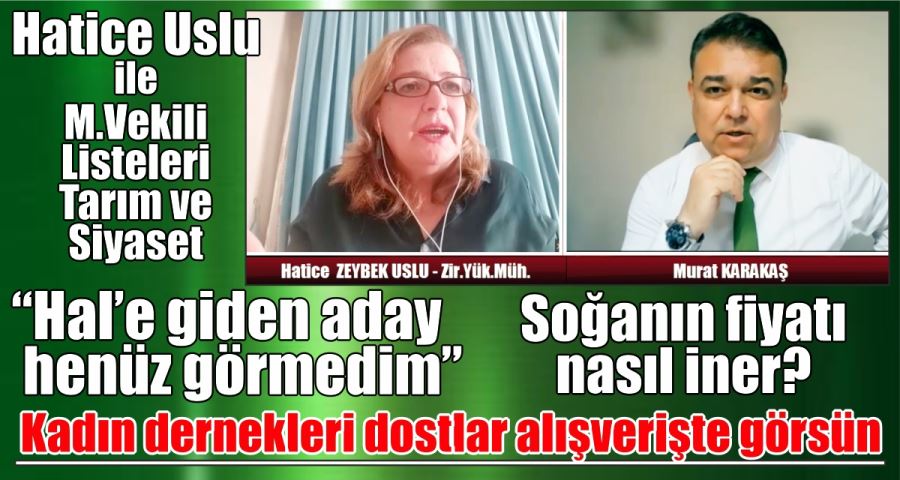 Ziraat Yüksek Mühendisi Hatice Zeybek Uslu zoom üzerinden www.bakircayturk.com'da konuk olduğu Murat Karakaş'ın yayınında milletvekili listelerini eleştirerek seçilebilecek yerden tarımcı yok diye konuştu. Eski partisi CHP'nin listelerinin halkta eleştiri ile karşılandığını ileri süren Zeybek "Şu ana kadar Hal'i ziyaret eden aday görmedim" dedi.