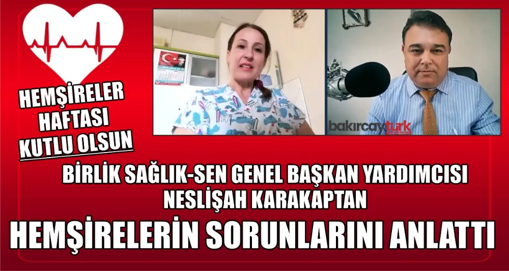12-18 Mayıs Hemşireler Haftası nedeniyle www.bakircayturk.com'da Birlik sağlık-Sen Genel Başkan Yardımcısı Hemşire Neslişah Karakaptan, Murat Karakaş'ın yayın konuğu olarak hemşirelerin günümüzde yaşadıkları sıkıntıları ve çözüm yollarını anlatttı. Yayını videoda izleyebilirsiniz.